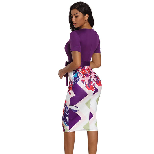 Bowknot Short Sleeve Printed Sheath Dress - Plus Size